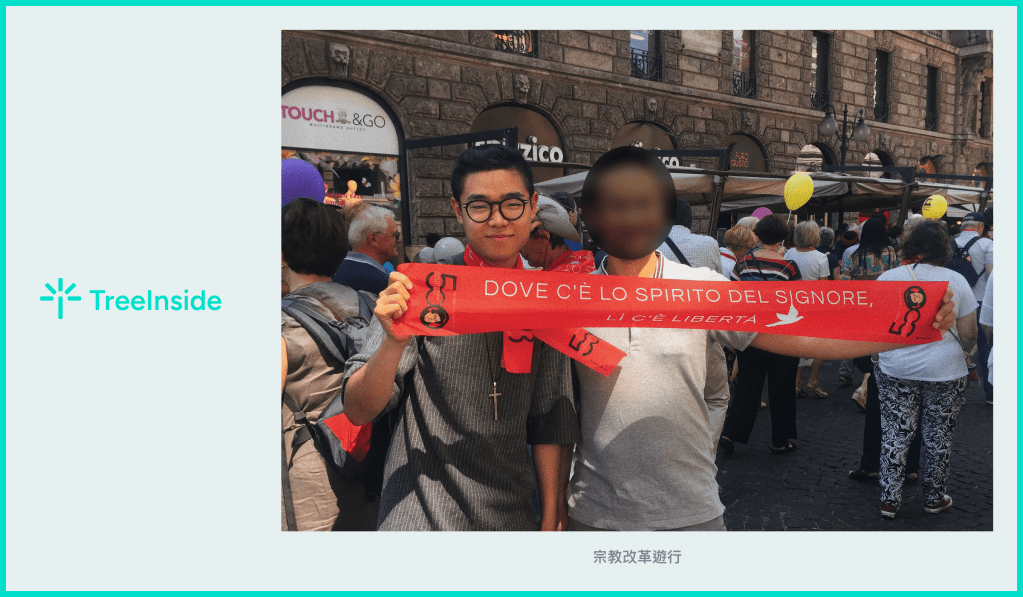 一次是在 2017 年義大利的基督教遊行,紀念五百年前的宗教改革。我們從米蘭大教堂出發,一路唱著詩歌,一路向路人展示一條寫著「Dove c’è lo Spirito del Signore, lì c’è libertà.(主的靈在哪裡,那裡就有自由)」的布條。